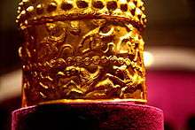 Almost a kilogram heavy, the gold helmet is very well preserved, missing only the part of its skull cap. The form of the helmet and its decorations reveal the autochthonous character of this Geto-Dacian artwork. The helmet is decorated with large studs on the top of the skull and two very large apotropaic eyes, meant to ward off the evil eye and magic spells.[1] It was established that it belonged to an unknown local Geto-Dacian king or to a local aristocratic noble, from around year 400 BC .[1] One theory — without any poof, however — is that this item was the sacred helmet of Zalmoxis, the living god-prophet of the Dacians.