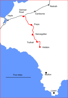 The line ran from Helston, in south-west Cornwall, to a junction with the main line of the Great Western Railway at Gwinear Road(50°11′50″N 5°20′51″W / 50.1972°N 5.3475°W)(50°06′25″N 5°16′17″W / 50.1070°N 5.2713°W). The connection there faced Penzance.