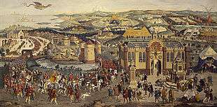 Stafford was on the commission directed to inquire into riots in Devon on 29 September 1514, and was in attendance in Westminster Abbey when Wolsey received his Cardinal's hat on 18 November 1515. Either in or before 1520 he became a member of the Privy Council, and in 1520 was appointed to attend the King at the Field of the Cloth of Gold in June, and at his meeting with the Emperor Charles V in July.[10] Dockray notes that Wiltshire's expenditure at court in the early years of the reign of Henry VIII must have been considerable, as by 1521 he owed the crown £4407 4s.[11]