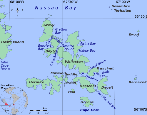 The Hermite Islands (Spanish: Islas Hermite) are the islands Hermite, Herschel, Deceit and Hornos as well as the islets Maxwell, Jerdán, Arrecife, Chantieler, Hall, Deceit (islet), and Hasse at almost the southernmost end of South America.[1] The smallest and southernmost of the major islands is Hornos Island, the location of Cape Horn. The islands are located south of the Wollaston Islands and separated from them by the Franklin Channel. The islets Terhalten, Sesambre, Evout and Barnevelt are located easterly and are not considered part of the Hermite islands.