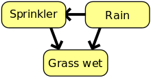 Suppose that there are two events which could cause grass to be wet: either the sprinkler is on or it's raining. Also, suppose that the rain has a direct effect on the use of the sprinkler (namely that when it rains, the sprinkler is usually not turned on). Then the situation can be modeled with a Bayesian network (shown to the right). All three variables have two possible values, T (for true) and F (for false).