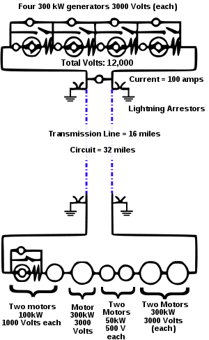 The first long-distance transmission of electric power was demonstrated using direct current in 1882 at Miesbach-Munich Power Transmission, but only 1.5 kW was transmitted.[11] An early method of high-voltage DC transmission was developed by the Swiss engineer René Thury[12] and his method was put into practice by 1889 in Italy by the Acquedotto De Ferrari-Galliera company. This system used series-connected motor-generator sets to increase the voltage. Each set was insulated from electrical ground and driven by insulated shafts from a prime mover. The transmission line was operated in a 'constant current' mode, with up to 5,000 volts across each machine, some machines having double commutators to reduce the voltage on each commutator. This system transmitted 630 kW at 14 kV DC over a distance of 120 km.[13][14] The Moutiers–Lyon system transmitted 8,600 kW of hydroelectric power a distance of 200 km, including 10 km of underground cable. This system used eight series-connected generators with dual commutators for a total voltage of 150,000 volts between the positive and negative poles, and operated from c.1906 until 1936. Fifteen Thury systems were in operation by 1913.[15] Other Thury systems operating at up to 100 kV DC worked into the 1930s, but the rotating machinery required high maintenance and had high energy loss. Various other electromechanical devices were tested during the first half of the 20th century with little commercial success.[16]