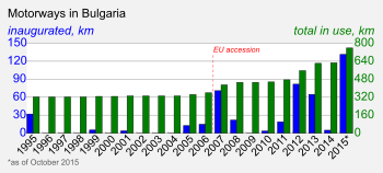 The initial plan for construction of motorways dates back to 1973, when the government of Socialist Bulgaria approved a resolution to build a motorway ring, encompassing the country and consisting of three motorways - Trakia, Hemus and Cherno More.[5] By the democratic changes in 1990, a total of 273 km of motorways had been built in Bulgaria.[6] By 2007, the year of accession to the EU, this had increased to approximately 420 km with predominantly state funding.[6] The EU accession of the country in 2007, and the improved in the recent years utilization of the allocated EU funds enabled Bulgaria to speed up the expansion of its highway network. As of September 2016, 786 km (488 mi) of motorways are in service, with another 36 km (22 mi) being under various stages of construction.