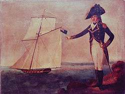 Painting c. 1797 of Commander John Crispo pointing to his former command, His Majesty's hired armed cutter Telemachus, National Maritime Museum, Greenwich.