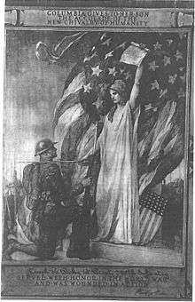 Early in World War I (1914–1918) the image of Columbia standing over a kneeling "Doughboy" was issued in lieu of the Purple Heart Medal. She gave "to her son the accolade of the new chivalry of humanity" for injuries sustained in "the" World War.