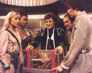 Glynis Barber (Soolin); Josette Simon (Dayna); Paul Darrow (Avon); Michael Keating (Vila) and Steven Pacey (Tarrant). Orac is in the foreground.