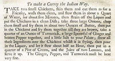 Curry was created by the arrival of the British in India in the seventeenth century, beginning as bowls of spicy sauce used, Lizzie Collingham writes, to add "bite to the rather bland flavours of boiled and roasted meats."[71] The 1758 edition of Hannah Glasse's The Art of Cookery contains what Clarissa Dickson Wright calls a "famous recipe"[72] which describes how "To make a currey the Indian way"; it flavours chicken with onions fried in butter, the chicken being fried with turmeric, ginger and ground pepper, and stewed in its own stock with cream and lemon juice. Dickson Wright comments that she was "a bit sceptical"[72] of this recipe, as it had few of the expected spices, but was "pleasantly surprised by the end result"[72] which had "a very good and interesting flavour".[72]