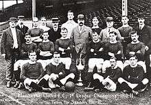 In January 1902, with debts of £2,670 – equivalent to £261,416 in 2015[2] – the club was served with a winding-up order.[3] Captain Harry Stafford found four local businessmen – including John Henry Davies, who became club president – each willing to invest £500 in return for a direct interest in running the club.[4] As a mark of this fresh start, on 24 April 1902, the club's name was changed to "Manchester United".[5][6] Under Ernest Mangnall, who became club secretary in 1903, the team finished as Second Division runners-up in 1906 and secured promotion to the First Division, which it won in 1908 – the club's first league title. The following season began with victory in the first ever Charity Shield[7] and ended with the club's first FA Cup title. Manchester United moved to a new stadium at Old Trafford in 1910, and won the First Division for the second time in 1911, but at the end of the following season, secretary Mangnall left to join Manchester City.[8]