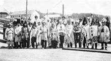 The first effort at organized labor activism of Vancouver longshoremen occurred in 1888, when a number of longshoremen became members of an American trade union called the Knights of Labor that had been formed in 1869.[31] In 1906, an estimated fifty to sixty lumber handlers, mostly Squamish, formed Local 526 of the Industrial Workers of the World (IWW).[31] This constituted the first union on the Vancouver waterfront. The informal name for the union was the "Bows and Arrows," a title reflective of the politicized indigenous ethos of its membership base.[32][6]:88 The union's casual structure, with members continuing to maintain seasonal employment in hunting and fishing, likely resonated with the IWW's ethos of decentralized organization (like the Squamish and Tsleil-Waututh, IWW ideology was "rooted in part in the itinerant lifestyle of its members"). Meetings were held on the Mission Reserve in North Vancouver.[6]:87 After a "nasty" strike in 1907 that included both Aboriginal and non-Aboriginal workers, the union was dissolved.[6]:87