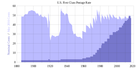 Taking the above data and plotting it yields the graph shown to the right. The dark plot is the nominal issued price of the stamp and the light plot is the price adjusted for inflation and is shown in 2016 US cents.