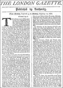 The Oxford Gazette was printed in 1665 by Muddiman in the middle of the turmoil of the Great Plague of London and was, strictly speaking, the first periodical to meet all the qualifications of a true newspaper. It was printed twice a week by royal authority and was soon renamed the London Gazette. Magazines were also moral tracts inveighing against moral decadence, notably the Mercurius Britannicus.[8] The Gazette is generally considered by most historians to be the first English newspaper.