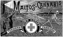At the turn of the 20th century the Scandinavian maltose- and cannabis-based drink Maltos-cannabis was widely available in Denmark and Norway.[19][25] Promoted as "an excellent lunch drink, especially for children and young people", the product had won a prize at the Exposition Internationale d'Anvers in 1894.[19] A Swedish encyclopedia from 1912 claim that European hemp, the raw material for Maltos-Sugar, almost lacked the narcotic effect that is typical for Indian hemp and that products from Indian hemp was abandon by modern science for medical use. Maltos-Cannabis was promoted with text about its content of maltose sugar.[26]