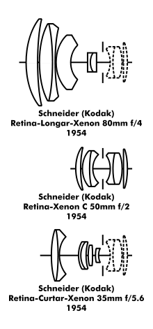 The Kodak Retina IIIc and IIc (USA/West Germany) collapsable lens 35mm rangefinder cameras of 1954 took the supplementary lens idea to the extreme with their interchangeable lens "components." This system allowed swapping the front cell component of their standard Schneider Retina-Xenon C 50mm f/2 lenses (a Double Gauss) for Schneider Retina-Longar-Xenon 80mm f/4 long-focus and Schneider Retina-Curtar-Xenon 35mm f/5.6 wide-angle components.[158][159] Component lens design is tightly constrained by the need to reuse the rear cell and the lenses are extremely bulky, range limited and complex compared with fully interchangeable lenses,[160] but the Retina's interlens Synchro-Compur leaf shutter restricted lens options.