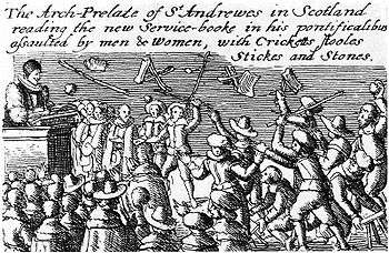 James VI was succeeded by his son Charles I in 1625. The father had divided his opponents; the son united them. Charles relied heavily on the bishops, particularly John Spottiswood, Archbishop of St. Andrews, eventually making him chancellor. At the beginning of his reign, Charles' revocation of alienated lands since 1542 helped secure the finances of the kirk, but it threatened the holdings of the nobility who had gained from the Reformation settlement.[45] In 1635, without reference to a general assembly of the Parliament, the king authorised a book of canons that made him head of the Church, ordained an unpopular ritual and enforced the use of a new liturgy. When the liturgy emerged in 1637 it was seen as an English-style Prayer Book, resulting in anger and widespread rioting, said to have been set off with the throwing of a stool by one Jenny Geddes during a service in St Giles Cathedral. The Protestant nobility put themselves at the head of the popular opposition. Representatives of various sections of Scottish society drew up the National Covenant on 28 February 1638, objecting to the King's liturgical innovations.[46] The king's supporters were unable to suppress the rebellion and the king refused to compromise. In December 1638 at a meeting of the General Assembly in Glasgow, the Scottish bishops were formally expelled from the Church, which was then established on a full Presbyterian basis.[47]