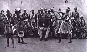 The most common founding myth traces the establishment of the kingdom to the royal lineage of Allada. According to this story, there was a Fon prince named Agassu in the city of Tado who tried to become king but lost the struggle and took over the city of Allada instead. Around 1600, two (in some versions three) princes in Agassu's lineage fought over who would be the ruler of Allada.[1] It was decided that both princes would leave the town and found new kingdoms with Teagbanlin going south and founding the city that would become Porto-Novo and Do-Aklin moving to the Abomey plateau to the north (Porto-Novo and the Kingdom of Dahomey remained rivals for much of history).[3] Do-Aklin's son Dakodonu was granted permission to settle in the area by the Gedevi chiefs in Abomey. However, when Dakodonu requested additional land from a prominent chief named Dan the relationship grew hostile. The chief responded to Dakodonu, with sarcasm, "Should I open up my belly and build you a house in it?" Dakodonu killed Dan on the spot and ordered that his new palace be built on the site and derived the kingdom's name from the incident (this may be a false etymology[4]): Dan=chief, xo=Belly, me=Inside of.[3]