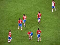 Paraguay were then scheduled to face Nigeria in their last group stage fixture on 24 June. The Albirroja had claimed just two points from two matches and Nigeria, on six points, were already through to the next round after winning their first two group stage matches. Paraguay required all three points from the fixture against Nigeria if they were to progress to the second round. In the first minute of the match, Celso Ayala headed Paraguay into the lead, latching on to a free kick, however, Wilson Oruma equalized for Nigeria in the 10th minute. Miguel Ángel Benítez then scored for Paraguay in the 58th minute, and as the second half concluded, José Cardozo received the ball in front of goal to put the ball low past goalkeeper Peter Rufai.[8] The match concluded 3–1 in favour of Paraguay as they finished in second position of the table with five points, and they would advance to the Round of 16, despite Spain's 6–1 win over Bulgaria but only finishing with four points on the table, to face hosts France. On 28 June, France and Paraguay met in Lens. France were without their number #10 Zinedine Zidane, and were held 0–0 by Paraguay for the entire duration of the 90 minutes. In the 114th minute of extra-time, Laurent Blanc scored for France, eliminating Paraguay via the golden goal rule.[9] At the conclusion of the competition, defender Carlos Gamarra and goalkeeper and captain José Luís Chilavert were selected as part of the All-Star Team.