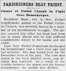 Polish Americans were represented in the American temperance movement, and the first wave of immigrants was affected by prohibition. A leading Pole in the The Temperance movement in the United States was Colonel John Sobieski, a lineal descendant of Polish King John III Sobieski, who served as a Union general in the American Civil War. In 1879, he married a prominent abolitionist and prohibitionist Lydia Gertrude Lemen, an American from Salem, Illinois. Through his wife's affiliation, he became a leading member of the Polish branch of the Women's Christian Temperance Union, and preached against alcohol in Ohio, Wisconsin, and Illinois to prohibition-camps. Sobieski and the predominantly Protestant Christian Temperance groups never made great in-roads into the Polish community. Polish Catholics immigrants frequently heard lectures and received literature from the Catholic Church against alcohol. Polish immigrants were distrustful of the Irish-dominated American Catholic Church, and did not resonate with the temperance movement in great numbers. A visit by Archbishop John Ireland to the PNA in St. Paul in 1887 was ineffective in drawing them to the Catholic Total Abstinence Union of America. The Polish language press covered the topic of abstinence occasionally in the U.S. It was not until 1900 that the PNA introduced sanctions for alcoholics among its membership, and abstinence generally was unpopular among American Poles. In New Britain, Connecticut, Father Lucian Bojnowski started an abstinence association which offended a local Polish club, he received a death threat in response.[46] In 1911, Father Walter Kwiatkowski founded a newspaper called Abystynent (The Abstainer) promoting local abstinence societies. The newspaper did not last long, and the Polish abstinence groups never united.[47] The Polish National Catholic Church never created official policies towards abstinence from alcohol, nor took it as a priority that differed from the Catholic Church.[47]