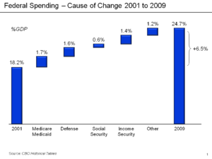 According to the Congressional Budget Office, the United States last had a budget surplus during fiscal year 2001. From fiscal years 2001 to 2009, spending increased by 6.5% of gross domestic product (from 18.2% to 24.7%) while taxes declined by 4.7% of GDP (from 19.5% to 14.8%). Spending increases (expressed as percentage of GDP) were in the following areas: Medicare and Medicaid (1.7%), defense (1.6%), income security such as unemployment benefits and food stamps (1.4%), Social Security (0.6%) and all other categories (1.2%). Revenue reductions were individual income taxes (−3.3%), payroll taxes (−0.5%), corporate income taxes (−0.5%) and other (−0.4%).
