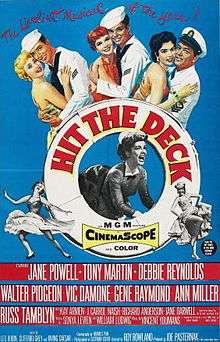 Hit the Deck is a 1955 American musical film directed by Roy Rowland and starring Jane Powell, Tony Martin, Debbie Reynolds, Walter Pidgeon, Vic Damone, Gene Raymond, Ann Miller, and Russ Tamblyn.[2] It is based on the stage musical of the same name – which was itself based on the hit play Shore Leave by Hubert Osborne – and was shot in CinemaScope. Although the film featured some songs from the stage musical, the plot was different.[3] Standards featured in the film include "Sometimes I'm Happy", "I Know that You Know", and "Hallelujah".[4][5]