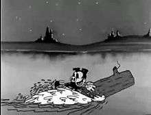Fluffy joins the frolicking steamboat passengers and reunites with her boyfriend, but during the revelry, Piggy falls overboard. The pig has a run in with an alligator, but he makes it back to the boat. Meanwhile, Uncle Tom's donkey bucks him into a cemetery. There, in a variation on a stock gag featuring a superstitious black man,[3] he is scared by three dancing skeletons reminiscent of those in Disney's 1929 short The Skeleton Dance. Tom escapes to the middle of the river, but a shoddy boat leaves him stranded and drowning. Piggy saves the day but not before a vaudevillian villain kidnaps his porcine paramour. Piggy captures the villain on a passing mail hook, leaving the villain tortured over a buzz saw. This short marks the second and last appearance of the characters Piggy and Fluffy.[2]