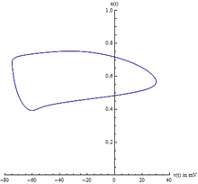Because there are four state variables, visualizing the path in phase space can be difficult. Usually two variables are chosen, voltage v(t) and the potassium gating variable n(t), allowing one to visualize the limit cycle. However, one must be careful because this is an ad-hoc method of visualizing the 4-dimensional system. This does not prove the existence of the limit cycle.