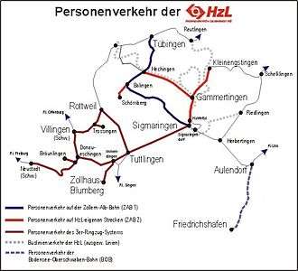 Its passenger operations now operate over a route network of more than 400 kilometres. From 1993, the HzL took over the operation of the Bodensee-Oberschwaben-Bahn, which now runs between Aulendorf and Friedrichshafen. In 1997, the HzL received a contract from the State of Baden-Württemberg for the operation of Regionalbahn services on the Tübingen–Sigmaringen railway, Danube Valley Railway and Herbertingen–Aulendorf railway, forming the Zollernalb Railway between Tübingen and Aulendorf.