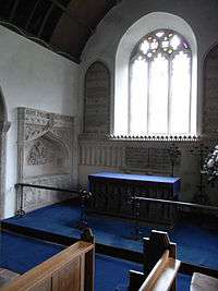 The altar is an ancient Spanish chest in carved oak from Culver House, one of the principal residences in the parish. The font is 15th century. There existed formerly next to the manor house a private chapel, demolished in the 18th century, the only remains of which are some stone blocks made into a mounting block by the church gate.