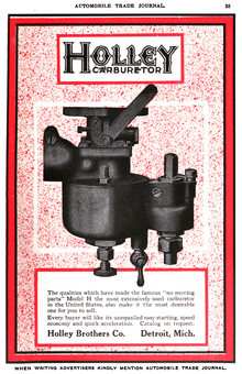 Holley began in Bradford, Pennsylvania in 1896 when brothers George (1878-1963) and Earl Holley started a company to produce a small one-cylinder three-wheeled vehicle they dubbed the "Runabout", with a top speed of 30 mph. At the eve of the era of motorcars, the brothers decided to start the Holley Motor Company, and produced one four-wheeled model: "The Holley brothers built their first marketable automobile in 1902. They called it the Holley Motorette and it sold for $550. More than 600 were produced." [1]