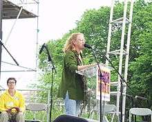 Near wrote a biography in the early nineties called Fire in the Rain, Singer in the Storm.[4] Later, with her sister Timothy, Near co-wrote a one-woman show based on the stories in the book. The show was presented at The San Jose Rep and in Los Angeles at The Mark Taper Forum, as well as productions in San Francisco and off Broadway in NYC. In April 2004, Holly performed at the March for Women's Lives in Washington, DC where she sang "We Are Gentle Angry People" and "Fired Up" a capella. The following year, Near was named among the "1000 Women for the Nobel Peace Prize".[5] Near continues an active tour schedule and as of 2012 had a discography of 29 albums.[6] She is still active as a performer and composer, and she has begun issuing CDs available through her website that include tracks from her out-of-print albums. Her song "Singing For Our Lives" appears in Singing the Living Tradition, the official hymnal of the Unitarian Universalist Association, under the title "We Are A Gentle, Angry People" (Hymn #170).[7] The hymn was also performed by Quaker Friends in an episode of the TV series Six Feet Under. In 2015, the same song, credited as "Singing For Our Lives" appeared in the Australian independent film The Lives We Lead, alongside its theme song "I Am Willing", another rousing Near-penned protest song.