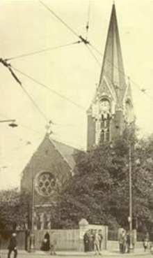 Holy Trinity Church was a Church of England parish church in Canning Town, east London. Its origins were in the Plaistow and Victoria Docks Mission, set up to serve the growing area of Hallsville by the vicar of St Mary's Church, Plaistow and Antonio Brady. It initially worshipped in the National School on Barking Road until the permanent church opened in 1867, with a parish formed for it the following year by parts of St Mary's and All Saints. Its advowson was initially vested in the bishop, but transferred to the Lord Chancellor in 1886 to allow the benefice of Holy Trinity to be supplemented from revenues from All Hallows Church, London Wall. It was badly damaged by bombing in 1941 but re-opened the following year. In 1948 it was closed and later bought by West Ham Borough Council, which demolished it and built flats on the site. A war damage payment to it instead went towards the construction of St Erkenwald's Church, Barking, opened in 1954.[1] The parish survived until 1961, when it was mostly merged into that of St Matthias' Church, Canning Town, whose vicar had administered it in the interim, though some of it passed to St Cedd's Church, Canning Town.[2]