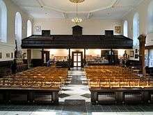 In 1740 the steeple collapsed, destroying most of the building. The only part of the church building that survives today is the Weston Chapel. Some external features such as the iron railings also remain from the earlier building, as do two monuments. A new red brick church was erected to the designs of James Horne on the site of the original church and opened in 1763.[2] The architecture has been described as "handsome and pedestrian at the same time", being of correct classical proportions but with details that are under-scale for such a large building on an important site.[7]