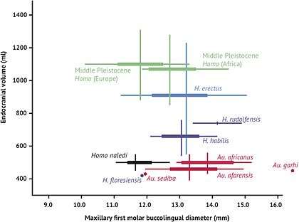 In 2013, fossil skeletons of Homo naledi, an extinct species of hominin assigned (provisionally) to the genus Homo, were found in the Rising Star Cave system, a site in South Africa's Cradle of Humankind region in Gauteng province near Johannesburg.[27][28] As of September 2015, fossils of at least fifteen individuals, amounting to 1550 specimens, have been excavated from the cave.[28] The species is characterized by a body mass and stature similar to small-bodied human populations, a smaller endocranial volume similar to Australopithecus, and a cranial morphology (skull shape) similar to early Homo species. The skeletal anatomy combines primitive features known from australopithecines with features known from early hominins. The individuals show signs of having been deliberately disposed of within the cave near the time of death. The fossils have not yet been dated.[29]