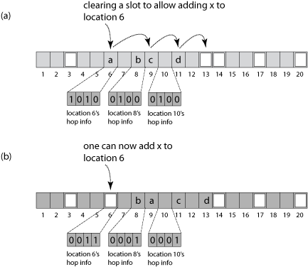 - If the empty entry's index j is within H-1 of entry i, place x there and return. Otherwise, entry j is too far from i. To create an empty entry closer to i, find an item y whose hash value lies between i and j, but within H-1 of j. Displacing y to j creates a new empty slot closer to i. Repeat until the empty entry is within H-1 of entry i, place x there and return. If no such item y exists, or if the bucket i already contains H items, resize and rehash the table.
