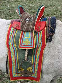 During races, the forelock is put in a topknot that stands up from the horse's head. The hairy part of the tail may also have a tie placed around it midway down.[8] For race horses, the owner will also have a wooden sweat scraper to clean off the horse after a race. After the Naadam, spectators will come up to touch the winning horses' mane and sweat as both a sign of respect and a way to imbibe good fortune.[8] The winning horse is also sprinkled with airag.[9]