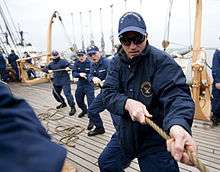 Eagle has a standing permanent crew of seven officers and 50 enlisted members; on training missions, she takes on a variety of temporary crew and sails with an average complement of 12 officers, 68 crew, and up to 150 trainees.[20] While on board, cadets and officer candidates receive a large amount of instruction from the crew. They take classes on numerous subjects that are key to life at sea, including navigation, seamanship, ship and boat maneuvering, line handling, sailing, first aid, weather patterns, damage control, engineering, career development, and more. They also stand watches in the engine room, on the bridge, on deck, in the scullery and galley, and during port calls, they assist the public by giving tours. The trainees are expected to qualify in a variety of watchstations applicable to their level of experience; for example, third class cadets complete their 'helm and lookout' qualification while upperclass cadets work to qualify in leadership positions on the bridge and in the engine room. At the same time, trainees are given a rigorous set of nautical tasks they must complete. One common training task involves the Eagle crew covering all Global Positioning System receivers on board and requiring trainees to navigate between ports using sextants, a compass, and the tools of celestial navigation.[21][22]