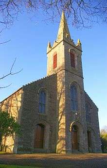There were at least two previous churches near the present site. The earlier of these was in constant need of repair according to 1674 Kirk Session minutes. This may have been the medieval church that was dedicated to the Virgin Mary and appropriated to the Abbey of Scone. A new church was eventually built in 1774 on the foundations of the old. It was described as an 'architectural abomination'.[56] By the 1830s the walls were bulging and cracked and the roof sinking. One or other of these older churches had a lintel stone bearing the inscription 'The Lord loveth the gates of Zion more than all the dwellings of Jacob'.[57] [lower-alpha 8] In the later 1830s when it was apparent that the 1774 church was unsound, Lord Gray offered land a little to its south-east and building stone from his quarry in the Den of Gray, so enabling the construction of the 1839 church at a cost of £2200.[41]