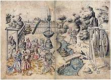 Master of the Housebook and Master of the Amsterdam Cabinet are two names used for an engraver and painter working in South Germany in the last quarter of the 15th century. He is apparently the first artist to use drypoint, a form of engraving, for all of his prints (other than woodcuts he may have designed). The first name derives from his book of drawings with watercolour, called the Housebook, which belonged to the German noble family of Waldburg-Wolfegg from the 17th century until 2008, when they were reported to have sold it for €20 million to a Swiss buyer.[1] However the legality of its sale for export has been challenged, and for the moment it remains with the family. In 1999, the book was loaned to the National Gallery of Art in Washington, D.C. for an exhibition. The majority of his surviving prints are in the print room at the Rijksmuseum in Amsterdam, hence his second name. Most, but not all, art historians still agree that the Housebook and the prints are by the same artist.[2]