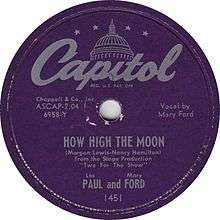 "How High the Moon" is a jazz standard with lyrics by Nancy Hamilton and music by Morgan Lewis. It was first featured in the 1940 Broadway revue Two for the Show, where it was sung by Alfred Drake and Frances Comstock.[1] In Two for the Show, this was a rare serious moment in an otherwise humorous revue.