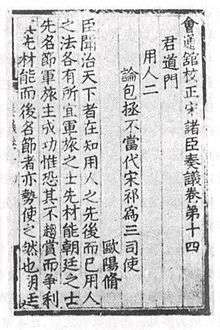 Hua Sui, who did not become a scholar until about the age of fifty, became interested in printing books.[6] He had accumulated a sizable fortune, and desired to use that fortune in order to establish the reputation as a printer in the region.[6] Hua Sui became the first of his familial clan to use his resources in establishing bronze-type printing in 1490. The first book printed in bronze-type in China was the Zhu Chen Zou Yi of that year (housed now in the National Central Library of Taipei, Taiwan), a simple collection of memorials printed in two editions.[6] The books printed by Hua Sui contain the signature Hui Tong Guan (Studio of Mastery and Comprehension), meaning he had mastered the process of metal movable type printing.[6] Including the Zhu Chen Zou Yi, published 15 titles using metal type, in a span of about 20 years.[6]