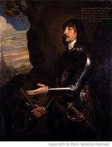 Shropshire became involved in the Second English Civil War largely because, in February 1648, John Byron, 1st Baron Byron, the former royalist regional commander and governor of Chester, was sent from Paris to foment royalist uprisings.[88] This resulted in royalist plot to seize Shrewsbury, which Mackworth detected and frustrated in April: those arrested were imprisoned in Ludlow Castle. Attempts to start a general uprising in Wales in May were confused and easily suppressed.[89] However, a wide-ranging plot involving royalist gentry in Herefordshire, Worcestershire and Shropshire that was uncovered and suppressed in early June caused consternation.[90] About 200 royalists were surprised at Boscobel and their leaders, including Dud Dudley arrested. The plan had involved seizing a house known as Dawley Castle and the nearby house of Sir Basil Brooke, presumably Madeley Court. It was the Worcester committee that took credit by reporting this to the Commons on 11 July and the Shropshire parliamentarians were instructed to demolish Dawley Castle.[91] An attempt to seize Chester Castle on 16 June came to nothing. The Shropshire committee had formed a safety committee and this at last acted on Mackworth's urgings of the previous year, ordering on 25 June that "the towne of Shrewsbury bee forthwith put into a posture of defence," that additional forces be raised and the walls speedily repaired. However, Robert Clive, an opinionated member of the committee, wrote in July to Speaker Lenthall complaining about the lack of action.[92] The Derby House Committee wrote to the Shropshire committee on 17 July that it should "keep a careful eye on that Castle, that it not be surprised by Malignants."[93]