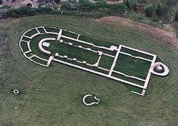 The territories attached to the Frankish Empire were initially governed by royal officers and local chieftains.[113] A Slavic prince named Pribina received large estates along the river Zala around 840.[114] He promoted the colonization of his lands,[115] and also erected Mosaburg, a fortress in the marshes.[114] Initially defended by timber walls, this "castle complex"[116] (András Róna-Tas) became an administrative center. It was strengthened by drystone walls at the end of the century. Four churches surrounded by cemeteries were unearthed in and around the settlement. At least one of them continued to be used up to the 11th century.[117]