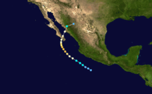 Upon becoming a tropical cyclone, the depression was initially forecast to remain over water.[2] Guided by a weak ridge near Baja California, the depression moved northwestward at about 20 km/h (10 mph) and paralleled the coast of Mexico for the next three days. Meanwhile, the tropical cyclone developed well-defined banding features. Based on this, the system was upgraded into Tropical Storm Fausto later that day.[1] While banding featured increased and the tropical cyclone became more organized and a well-established upper-level outflow, the National Hurricane Center (NHC) re-assessed the intensity at 70 mph (195 km/h).[3]