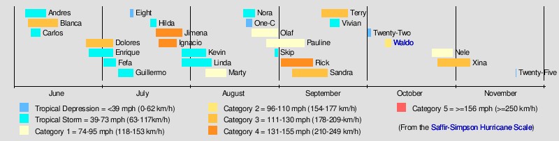 | Strongest storm1 | Rick – 951 mbar (hPa) (28.08 inHg), 145 mph (230 km/h) (1-minute sustained) |