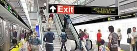 The Program for Action proposed a Second Avenue line to be built in two phases: The first phase would start from 34th Street in Midtown, running up Second Avenue to 126th Street and continuing to the Bronx, with stops planned at Kips Bay (34th Street), United Nations (between 44th Street and 48th Street), Midtown East (57th Street), Yorkville (86th Street), Franklin Plaza (106th Street), and Triboro Plaza (125th Street).[9][24] The 48th Street stop would connect to a planned Metropolitan Transportation Center at Third Avenue and 48th Street, which would contain a new east side terminal for the Long Island Rail Road. The line included older proposals for connections to the Sixth Avenue and Broadway lines in Midtown via a new crosstown line, which would now be located on 63rd Street.[24] The BMT 63rd Street Line would also include a connection allowing Second Avenue line trains to run to Queens. In the Bronx, the line would run along East 138th Street, with a cross-platform transfer to Lexington Avenue Line trains at Brook Avenue on the IRT Pelham Line, which would be reconfigured. After that, Second Avenue line trains would use a new express bypass line along East 138th Street, and the former tracks of the New York, Westchester and Boston Railway (NY&WB) near the Bruckner Expressway.[24] In Hunts Point, service would split into two branches. One branch would continue to use former NY&WB trackage to East 180th Street, at which point the line would connect to the IRT Dyre Avenue Line. A second branch would connect to the IRT Pelham Line in the vicinity of Whitlock Avenue station, another element from earlier plans. The first branch would take over all service on the Dyre Avenue Line, offering cross-platform transfers to IRT White Plains Road Line trains at East 180th Street station, which would also be reconfigured. The second branch would take over service on the upper portion of the Pelham Line, between Whitlock Avenue and Pelham Bay Park. All stations on the Dyre Avenue and upper Pelham Lines would have platforms shaved back to accommodate larger B Division trains.[9][24]