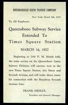 - 1 2 "New Queens Subway Opened to Times Sq.". New York Times. March 15, 1927. p. 1. Retrieved 2011-10-02.