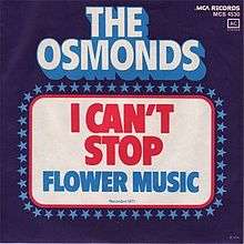 "I Can't Stop" is a song written by Jerry Goldstein and Wes Farrell and performed by The Osmonds. The group released the song as a single three different times. The song was originally released in 1967, but did not chart. It was released again in 1971 and reached #96 on the Billboard chart.[1] It was reissued once again in 1974 and reached #12 on the UK Singles chart.[2]