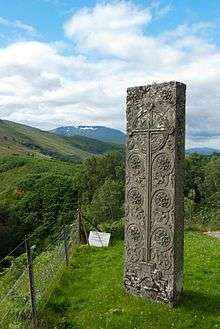 The Bard is also believed to have been present at the Battle of Killiecrankie in 1689 when he would have been in his mid-sixties. Two poems about the battle are attributed to him although it has been suggested that one of these may have been written by his son. Cath Raon Ruairidh, the Gaelic name for Killiecrankie, is sited as evidence that Dundee was shot just below his breast plate, and not, as later suggested by Professor Terry, in his left eye.[8] Iain Lom dismissed William of Orange as "a borrowed king" and condemned Mary for her disloyalty to her father.[9] The Massacre of Glen Coe was roundly condemned in Murt Glinne Comhann. Iain Lom's suggested punishment for the murder of his MacDonald kinsfolk was that the Campbell land in its entirety should be transferred to Clan Donald. Oran an Aghaidh and Aonaidh (A Song Against the Union) in which he condemned the Scottish aristocracy who had accepted union with England in 1707 is regarded as the last work that can be attributed to him and it is assumed that his death must have been soon afterwards.[10]