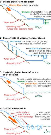 Ice shelves – thick layers of ice floating on the sea – can stabilise the glaciers that feed them. These tend to have accumulation on their tops, may experience melting on their bases, and calve icebergs at their periphery. The catastrophic collapse of the Larsen B ice shelf in the space of three weeks during February 2002 yielded some unexpected observations. The glaciers that had fed the ice sheet (Crane, Jorum, Green, Hektoria – see image) increased substantially in velocity. This cannot have been due to seasonal variability, as glaciers flowing into the remnants of the ice shelf (Flask, Leppard) did not accelerate.[10]