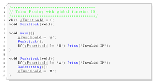 The implementation is simple and efficient. Every function is tagged with a unique function ID. When the function is called, the function ID is saved in a global variable. The function is only executed if the function ID in the global variable and the ID of the function match. If the IDs do not match, an instruction pointer error has occurred, and specific corrective actions can be taken. A sample implementation of token passing using a global variable programmed in C is stated in the following source listing.
