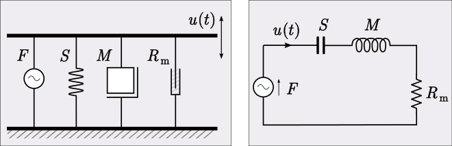 The figure shows a mechanical arrangement of a platform of mass M that is suspended above the substrate by a spring of stiffness S and a damper of resistance R. The impedance analogy equivalent circuit is shown to the right of this arrangement and consists of a series resonant circuit. This system has a resonant frequency, and may have a natural frequency of oscillation if not too heavily damped.[23]